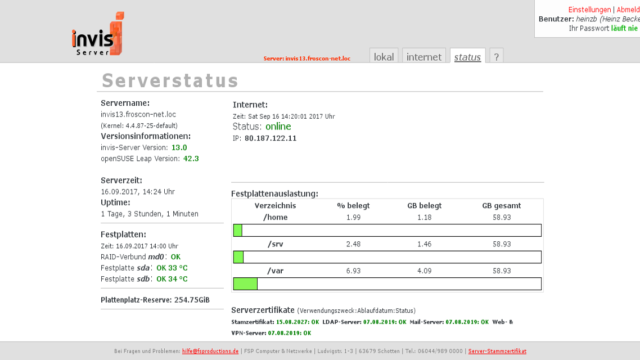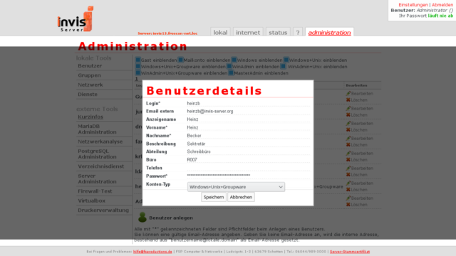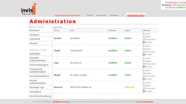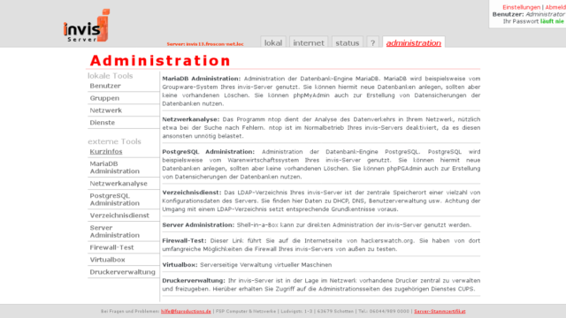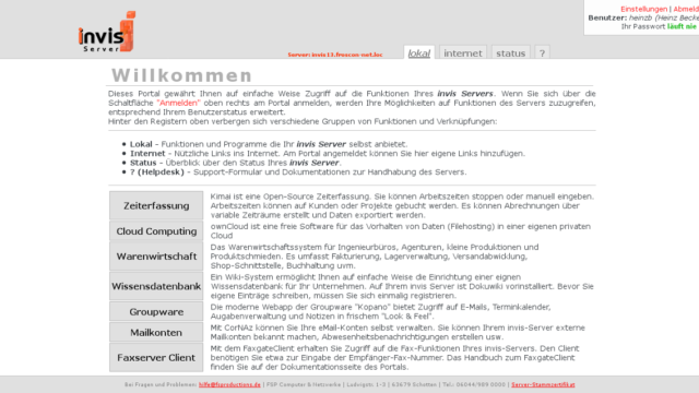 lokal – Zugriff auf Groupware (Group-e oder Zarafa), ERP-System (Kivitendo oder Wawision), Mailkontenverwaltung, Wiki-System (Dokuwiki), CD-Brenner (WebCD-Writer), Faxserver-Client sowie Mailinglisten (Mailman), also die Hauptanwendungen des invis Servers.